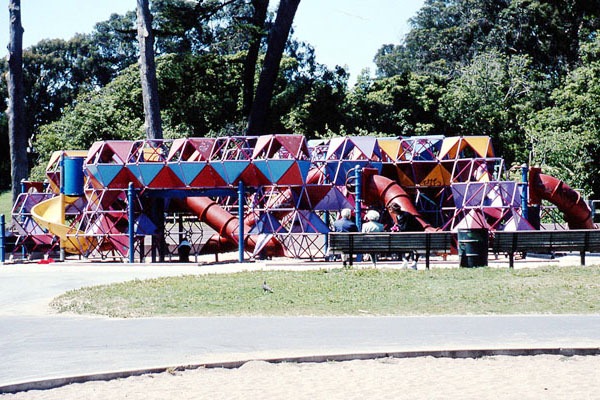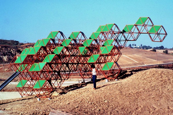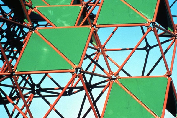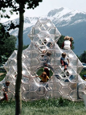 Applications in recreational environments seemed like opportunities, such as children’s play spaces and educational toys and games. Two distinct but related approaches to playground structures were undertaken with effective results. One system, based upon the saddle polyhedra and continuous surface morphologies was implemented under the name of Curved Space. A second system, predicated on the geometry of triangulated frameworks was made possible by the development of the Multihinge system. Called Climbing Clusters, this was the first real application of the Multihinge structural system. Both these systems are described and shown with many installed projects. Educational toys were also developed and are presented in another section of this website. Both the playground structures and the educational toys were developed and produced under the auspices of a company called Synestructics, Inc., which was co-founded by Pearce and Michael S. Bank. This company, which eventually evolved into Pearce Structures, Inc., was in operation from approximately 1970 to 1980.